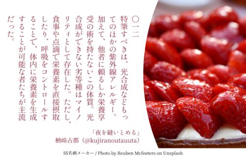 〇一二 特筆すべきは、光合成などもってのほかの紫外線アレルギー。 加えて、他者に頼るしか栄養享受の術を持たないこの体質。 光合成ができない劣等種はマイノリティとして存在した。 ただし、食事や点滴で栄養素を直接摂取したり、 呼吸をコントロールする…